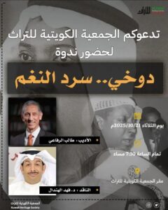 نظمت الجمعية الكويتية للتراث في مقرها ليلة الثلاثاء الموافق ٢١/١٠/٢٠٢٥م ندوة بعنوان “دوخي.. سرد النغم” للأديب طالب الرفاعي، أدارها الناقد د. فهد الهندال. و قد