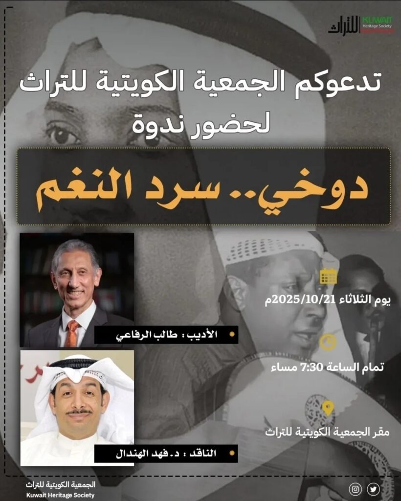 نظمت الجمعية الكويتية للتراث في مقرها ليلة الثلاثاء الموافق ٢١/١٠/٢٠٢٥م ندوة بعنوان “دوخي.. سرد النغم” للأديب طالب الرفاعي، أدارها الناقد د. فهد الهندال.