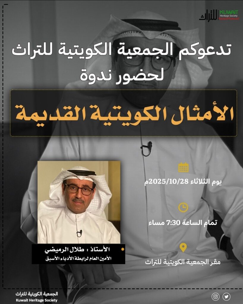نظمت الجمعية الكويتية للتراث في مقرها الثلاثاء ٢٨-١٠-٢٠٢٥م محاضرة بعنوان “الأمثال الكويتية القديمة”، قدّمها الباحث في التراث الكويتي طلال الرميضي، وأدارها عضو مجلس إدارة الجمعية الباحث صالح المسباح. شهدت الفعالية حضور نخبة من المهتمين بالتراث الكويتي والأدب الشعبي.