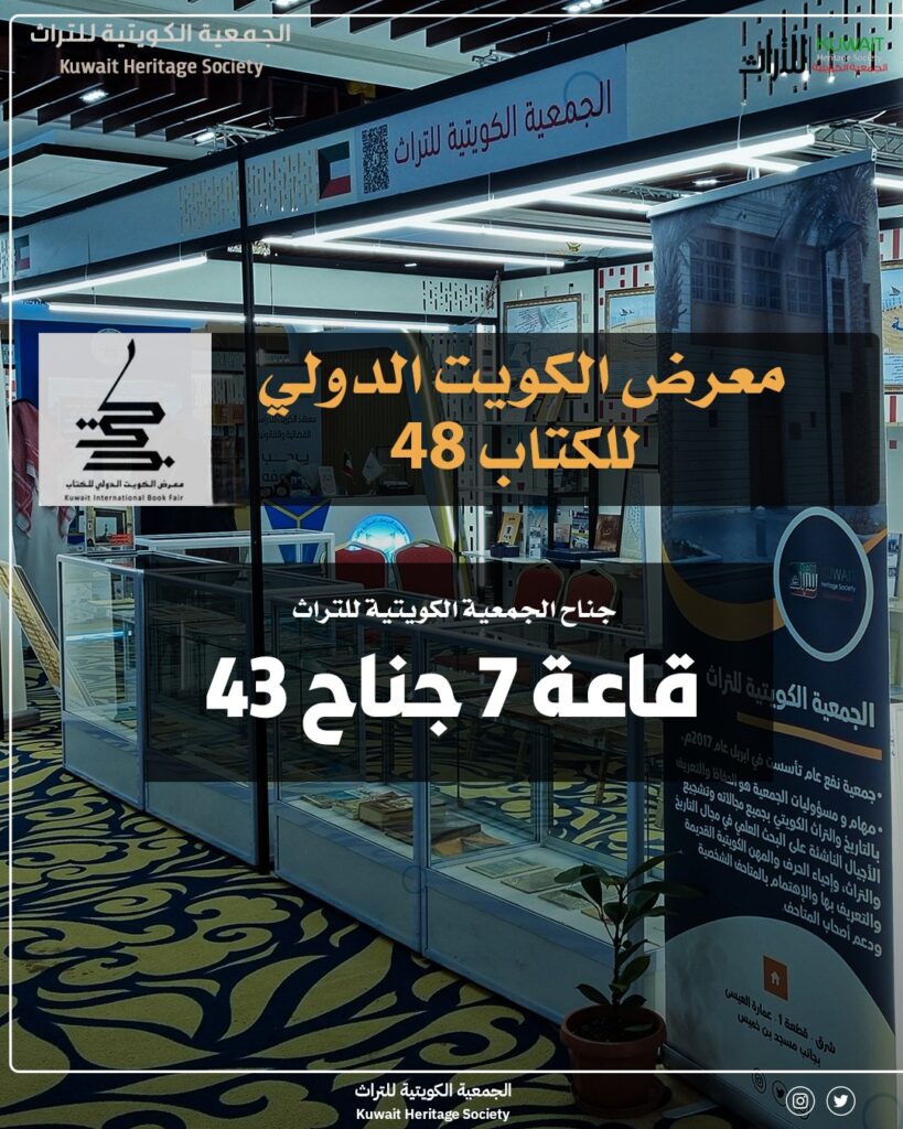تشارك الجمعية الكويتية للتراث في معرض الكويت الدولي للكتاب 48بعنوان “عاصمة الثقافة وطن الكتاب”المقام في أرض المعارض الدولية في مشرف قاعة “7” جناح “43”.
